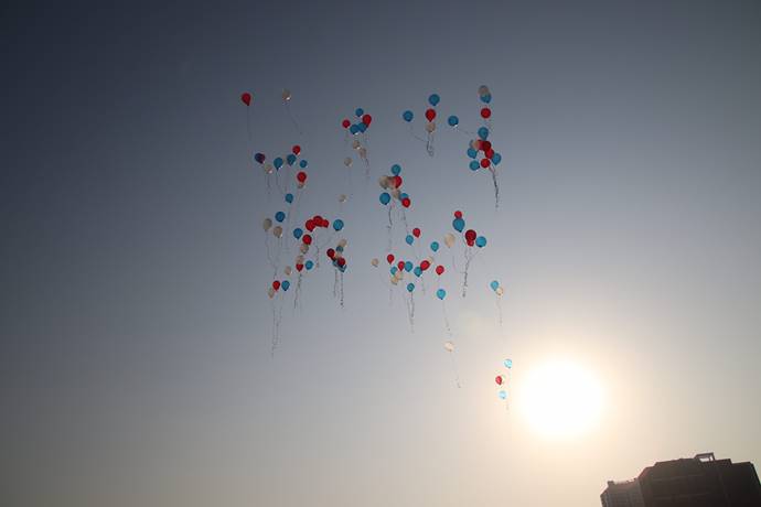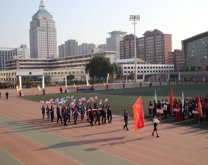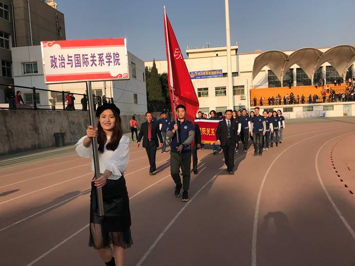 方阵在全场注目中入场。随着运动进行曲的铿锵节奏,党委书记姚志海、院长汪金国、副书记贾海燕、副院长曾向红带领队列迈着整齐划一的步伐走向主席台。同学们舞动着彩色的气球,齐声喊出“为人以正,为政以德,大成政国,公行天下”院训。在看台观众的欢呼声中,同学们放飞气球,蔚蓝天空顿时一片绚丽。