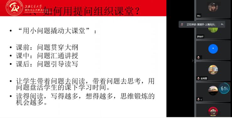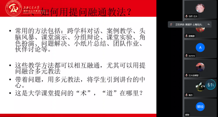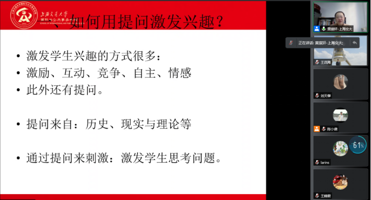 国际关系系副主任黄琪轩教授为木瓜视频教师做了题为“以问题贯穿课堂:用提问激发兴趣”的线上讲座,副院长陈小鼎教授主持。