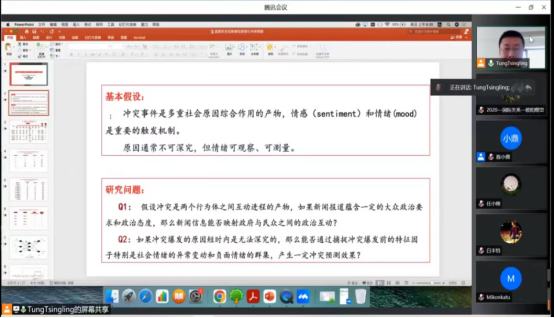 接着,董老师阐述话题研究“数字时代国家安全态势的感知原理与实践”及其取得的一些成果。该研究的基本假设为冲突事件是多重社会原因综合作用的产物,情感和情绪是重要的触发机制。研究逻辑为冲突是社会互动的产物,研究者要捕捉冲突互动过程中最具预示效果的因子:即人的负面情绪,该因子在国际政治的理性分析中具有很强的影响力。董老师举例,恐怖主义作为社会冲突的一种,反映了民众和政府之间的一种互动过程,即民众对政府提出的要求未得到满足所产生的压力情绪无法诉诸,转化为恐怖主义极端行动。通过观察社会情绪衰落周期与英国恐怖袭击频次相关性的研究思路,基本可以印证:社会情绪的持续走低与恐怖主义袭击的爆发频次是有密切关系的。