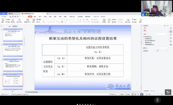 首先,杨娜教授介绍选题背景与研究问题。大量成功经验存在的情况下,为什么还会出现国际议程设置失败的现象?影响国际议程设置成败的关键因素有哪些?在此基础上,杨老师提出三个问题,一是为何对全球传媒和国际组织具有巨大影响的主要大国所设置的部分议程没有被广泛接受;二是为何一些明显具有国际或区域共性的问题没有被成功纳入到国际议程之中;三是哪些因素影响了国际议程设置的成败。