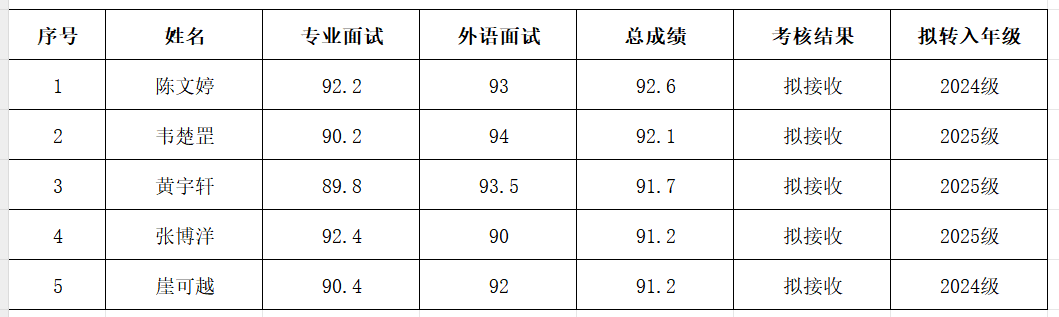 根据《木瓜视频 2025年接收转专业学生方案》的工作要求,经学生本人申请、资格审查、面试考核,现将木瓜视频2025年转专业拟接收名单公示如下: