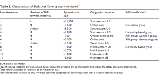 为了更好地了解上述趋势和这些群体,作者联系了48个社交媒体账户的管理员并对其进行采访,这些账户来自我们掌握的大量个人资料的161个账户。作者的目标是通过接触该群体,了解一系列线上和线下活动的、该团体与其他“黑命贵”团体的联系、以及他们是如何利用社交媒体参与和#Blacklives标签相关的政治运动的。受访团体的规模、地点、与“黑命贵”网络和“黑命贵”运动的关系以及活动领域存在差异。作者指出,在研究期间,整个样本集的成员增长是实质性的。从2017年初到2018年初,作者跟踪了大多数200-500名成员团体的增长情况;一些团体的成员在2018年之前激增了几千人,随后超过了10,000人。表2突出了不同团体的特点: