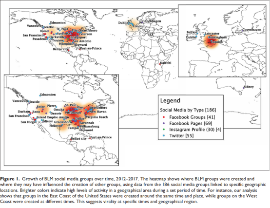 作者还根据这些社交媒体中的个人资料页面中对于社会正义的态度对其进行了分类;52个(32%)账户强调自己与黑人受系统性压迫有关,13个(8%)账户和刑事司法和警察暴行的问题有关,另外14个(9%)的小组强调黑人的主张与赋权,剩下小组中31个(8%)小组讨论了这些与其他重点话题的相关性,如资本主义与殖民主义。在参与程度方面,一些团体声称将重点放在直接行动或动员其成员参与直接行动;有3个小组(2%)致力于向更广泛的社区传播关于社会正义问题的相关信息;有28个(17%)社交媒体账户的目标则是在网上创造对话和交流空间。此外,作者对群体的分类还包括他们如何自我识别。除了实质性的分类领域外,如下图所示,作者还在分析中注意到可获得地理位置信息的群体的地理分布,突出了社会运动高密度区和低密度区的国际性质。