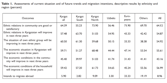 在所有关于未来的评估中,吉尔吉斯人内部存在显著的地区差异:对于吉尔吉斯斯坦整体未来的经济发展以及地区经济状况的改善,南方人也明显不如北方人乐观。乌兹别克人向国外移民的倾向非常低,北部吉尔吉斯人比南部吉尔吉斯人更倾向于离开这个国家。