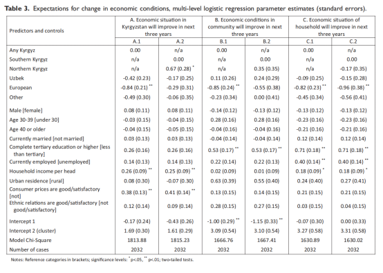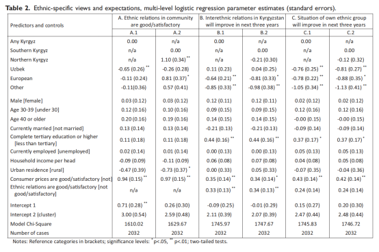 作者考察的第二组结果是对国家、社区和家庭层面经济状况未来趋势的看法。他假设吉尔吉斯人比所有的少数族裔更有可能在上述三个层面上取得进步(假设2a)。在少数族裔群体中,欧洲裔对经济前景最不乐观(假设2b)。作者预计,受访者对于吉尔吉斯斯坦北部的经济前景应该比南部更乐观,因为吉尔吉斯斯坦北部是该国经济更发达的地区,也因为他们可能认为由北方部族控制的政府更满足他们的需求(假设2c)。