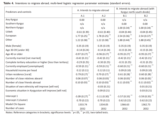 最后,作者检验了不同族裔民众从吉尔吉斯斯坦向其他国家移民的倾向。需要注意的是,移民倾向在这里不是作为实际移民情况的预测指标,而是作为国家归属的额外指标。作者假设,与不分地区的吉尔吉斯人相比,所有少数族裔成员应该更倾向于向国外移民(假设3a)。移民倾向在欧洲裔民众中尤其强烈(假设3b)。与此同时,由于移民意图可能反映出对吉尔吉斯斯坦未来的预期,作者预计无论是一般的多数族裔与少数族裔的分歧还是欧洲裔显著的移民倾向,都将通过对自身所属的族裔和国家经济发展前景的评估来进行调节(假设3c)。
