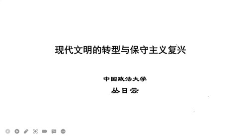 针对西方当代社会的变化,丛日云教授提出一种新的解释框架,他指出,西方发达社会正在发生一场价值革命,即从物质主义价值观转向后物质主义价值观或自我表现价值观。相应地,现代文明开始过渡到后现代文明。对于保守主义在当代的复兴,丛老师肯定了现存诸多解释的合理性,但他强调这种复兴是对后现代主义的被动反应,其使命是从整体上抵制、遏制后现代主义。