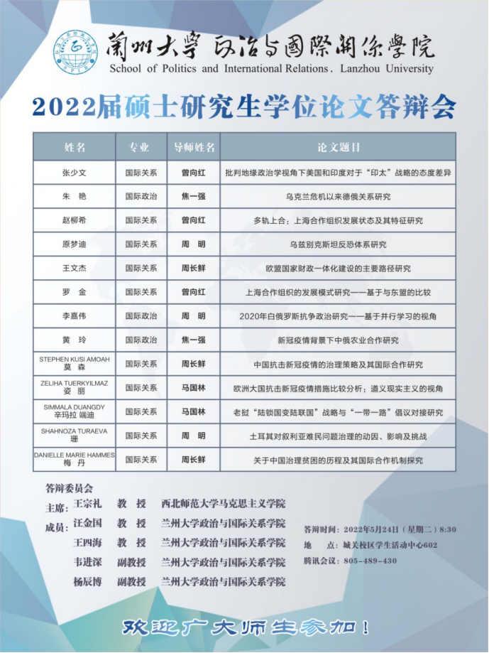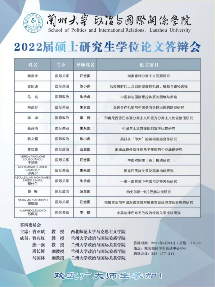 王宗礼教授、曹亚斌教授分别担任本次学位论文答辩委员会主席,汪金国教授、曾向红教授、焦一强教授、王四海教授、周长鲜副教授、马国林副教授、韦进深副教授、杨辰博副教授担任答辩委员会成员,张维维老师、宁彧老师担任答辩秘书。