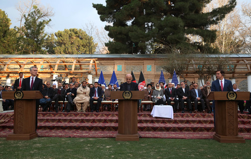 2020年2月29日,在阿富汗首都喀布尔,美国国防部长马克·埃斯珀(前右)、阿富汗总统阿什拉夫·加尼(前中)和北约秘书长延斯·斯托尔滕贝格在新闻发布会上。当日,美国和阿富汗塔利班在卡塔尔首都多哈签署旨在结束阿富汗战争的和平协议。新华社发