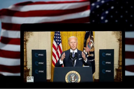 这是2月19日在美国弗吉尼亚州阿灵顿拍摄的美国总统拜登出席慕尼黑安全会议线上特别会议的视频画面。