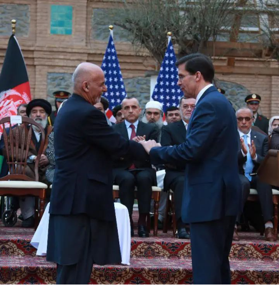 2020年2月29日,在阿富汗首都喀布尔,美国时任国防部长马克·埃斯珀(前右)在新闻发布会上与阿富汗总统阿什拉夫·加尼握手。当日,美国和阿富汗塔利班在卡塔尔首都多哈签署旨在结束阿富汗战争的和平协议。
