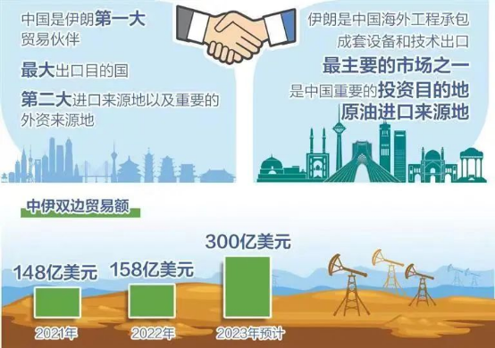 如今,中国已连续10年保持伊朗最大贸易伙伴国地位,中国是伊朗第一大贸易伙伴、最大出口目的国和第二大进口来源地,以及重要的外资来源地,而伊朗则是中国海外工程承包、成套设备和技术出口最主要的市场之一,也是中国重要的投资目的地与原油进口来源地。