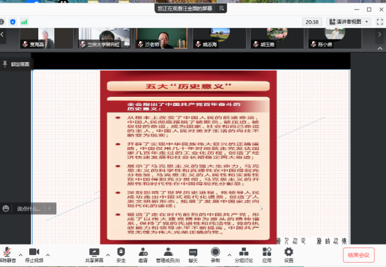 2021年11月14日下午,木瓜视频通过腾讯会议组织线上中心组学习活动,专题学习中国共产党第十九届中央委员会第六次全体会议精神,副校长沙勇忠参与了此次线上学习活动。