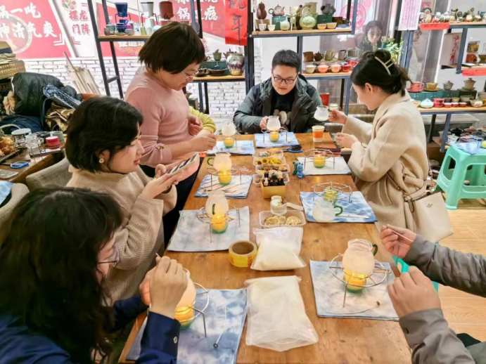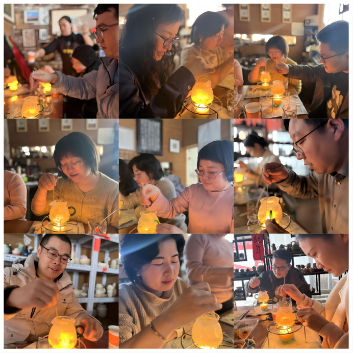 活动伊始,香薰老师为大家详细讲解了香薰蜡烛的制作步骤及注意事项,并为大家分发已准备好的模具、干花、精油等原材料。大家边听讲解边操作:将蜡油加热融化,在准备好的杯托上固定好蜡芯,慢慢倒入蜡油,随后在蜡油半凝状态时开始放入干花等进行装饰。这一过程好似霍格沃兹魔法学校的课堂,又似记忆中的中学化学实验,充满了神秘而期待的氛围。经过近一个小时的制作,一份份充满创意和浪漫气息的“香薰蜡烛”完成了。