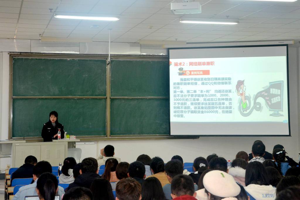 活动伊始,雷老师对本次讲座做了简要介绍,并指出当代大学生防诈骗的重要性。本次讲座主要分为两部分,一是介绍常见的诈骗套路,二是帮助同学们掌握防诈骗的方法。在第一部分,民警列举了刷单兼职、网络贷款、冒充QQ好友、冒充客服、网络交友、冒充国家相关工作人员调查等几种常见骗术及相关案例,警醒同学们现实生活中的骗局无处不在。在第二部分,民警对如何预防、识破和应对电信网络诈骗进行详细讲解,使同学们了解防诈骗的基本技能与补救措施。活动期间,同学们积极参与互动并认真做好相关笔记。最后,雷老师对讲座进行总结,讲座圆满落幕。