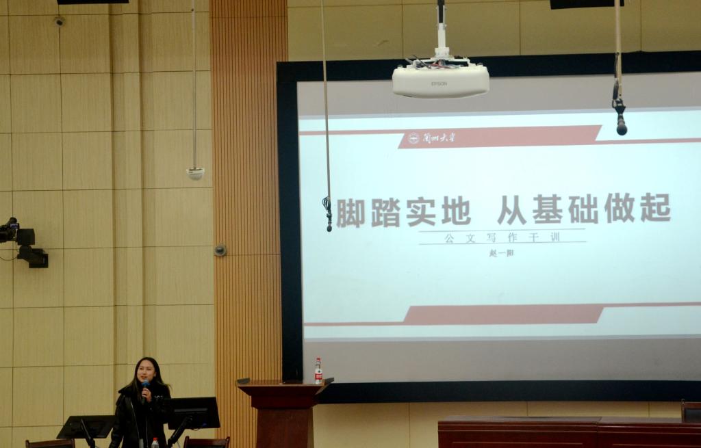 19级的赵一阳同学为大家进行了以“脚踏实地,从基础做起”为主题的报告,报告中详细介绍了公文写作的格式、要求等相关知识,规范同学们对公文写作的认识,使本次干训活动圆满结束。