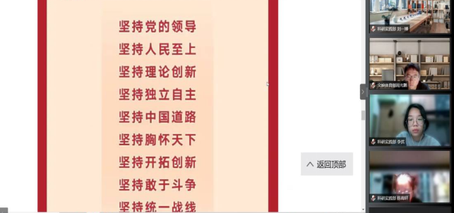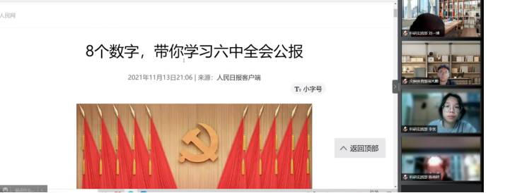 会议伊始,田歌老师针对十九届六中全会精神的内涵进行概括性发言,指出这次会议是对党在百年历史以来对其取得的成就和经验进行总结。随后,孟祥毅以人民网发布的关于《8个数字学习十九届六中全会公报》的文章为学习线索,分别从三个“需要”、两个“确立”、五大“历史意义”、十个“坚持”、牢记一个“根本问题”、四个“必须”、一次“十分重要的代表大会”以及一个“号召”方面,带领全体参会人员具体深入地了解十九届六中全会的具体情况。紧接着,孟祥毅继续带领同学就习近平主席关于《中共中央关于党的百年奋斗重大成就和历史经验的决议》的说明进行学习。除此之外,他还向大家推荐《关于若干历史问题的决议》、《关于建国以来党的若干历史问题的决议》等文章,鼓励同学们在会议之后积极主动阅读学习。其后,各部门工作人员分别对此次会议的学习心得进行分享交流。孟祥毅提到,他希望大家关注十九届六中全会公报中的细节和表述方式,并从中汲取有助于我们专业知识学习的部分。学生团委副书记安丙淏则用一句话总结自己的理解,“人民就是江山,江山就是人民”,并指出我们应从人类命运共同体理念出发,站在世界的角度,理解人民的理念。随后,学生团委副书记康庆玉分享道,此次党的会议对青年干部的眼界和思想层次提出更高要求,我们都应立足全球,树立大局意识。紧接着,科研实践部负责人韩雅宁、文娱体育部卫繁星以及青年志愿者协会负责人贺承松等同学也分享了自己的看法。至此,会议圆满结束。