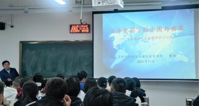 于11月26日下午16:30在榆中校区第二教学楼A404举办“‘立德树人·筑梦未来’第六届我最喜爱的十大教师”候选人曹伟老师见面会。曹伟老师发表“百年变局下的中国与世界——十九届六中全会精神学习心得”主旨演讲,木瓜视频2021级全体同学参加本次见面会。