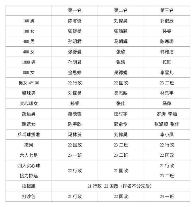 在跳远比赛中,选手们如羽毛腾滞空中那般轻盈,轻轻一跃便是两米多的佳绩。结束了跳远比赛,观众的目光纷纷转向铅球比赛,选手们以身作弓、以球作箭,在深呼吸后奋力将球推出,球体划过湛蓝色的天空落在地上,扬起了地面的沙土,也激起了观众的阵阵喝彩。接力比赛中的每一次交接都将观众的情绪推向高潮,拔河比赛时的每一声喝彩都为选手注入力量,众人的意志凝聚在一起,浇筑成最终的胜利。