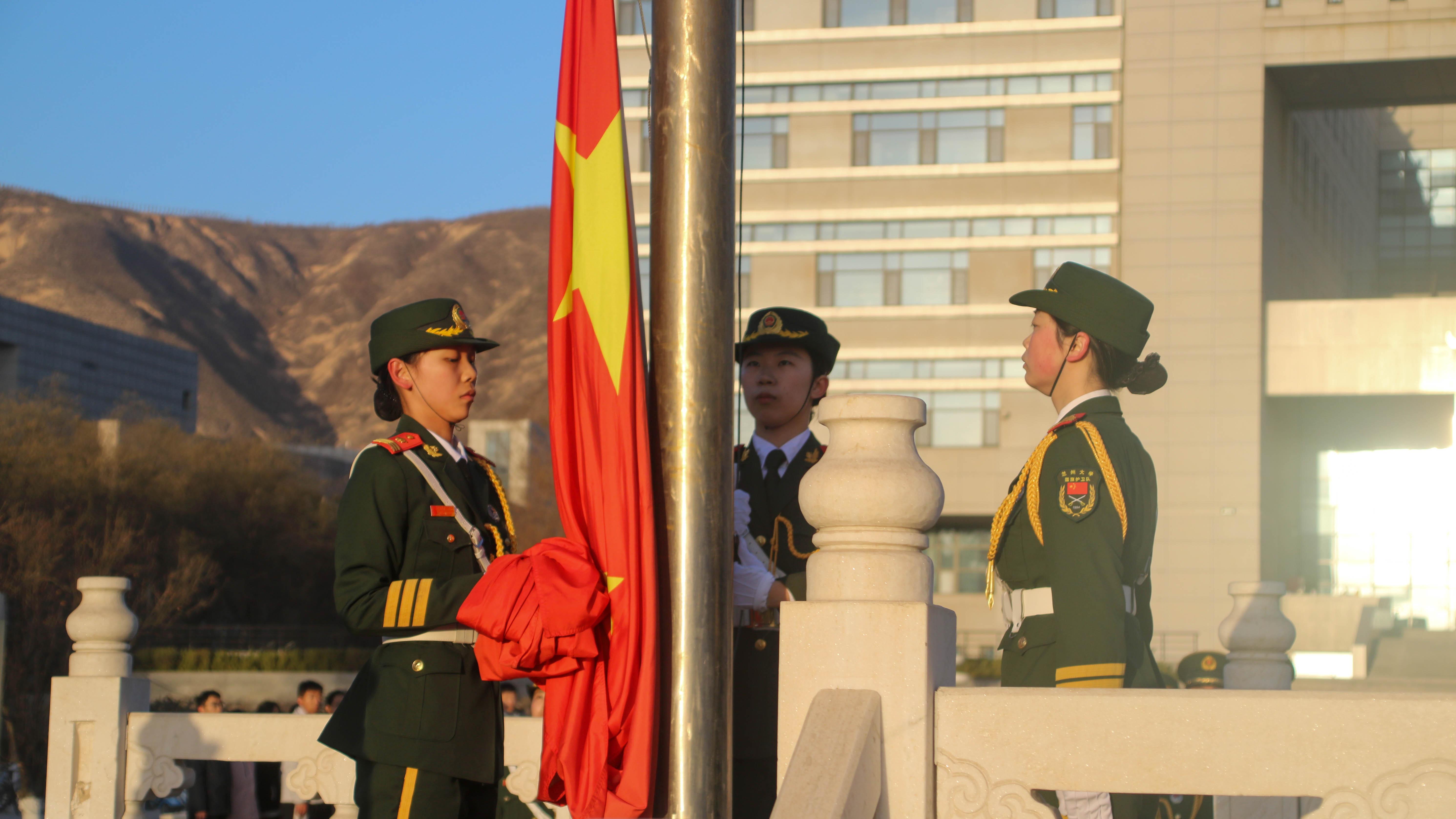 随着一声坚定有力的口令,升旗手奋力一挥,五星红旗在微风中肆意舒展,好似一抹跃动的霞光。在场的学生队列整齐,目光庄重而炽热,追随着缓缓上升的五星红旗。每一双眼睛里,都映照着国旗的鲜红,包含着无尽的崇敬与热爱。嘹亮的歌声与激昂的旋律交融,冲破云霄,激励着在场的每一个人。在这庄严肃穆的氛围里,爱国之情如燎原之火,在兰大学子心中熊熊燃烧,强国之志也在同学们心底悄然扎根、拔节而生。