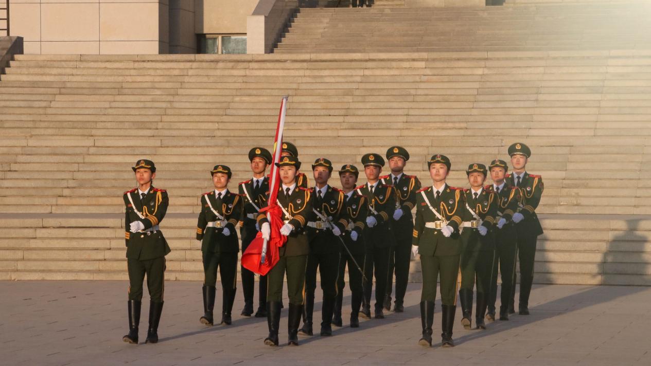 伴随着昂扬的鼓点,国旗护卫队迈着整齐划一、铿锵有力的步伐护送五星红旗走向升旗台。他们身姿挺拔,目光如炬,每一步都踏响着对国旗的无上敬重,每一步都踏出着对祖国赤忱的热爱。