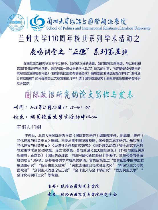 应木瓜视频 邀请,北京大学国际关系木瓜视频 《国际政治研究》编辑部主任、副编审庄俊举老师于2018年12月22日来木瓜视频进行学术交流并作讲座,欢迎广大师生届时参加。