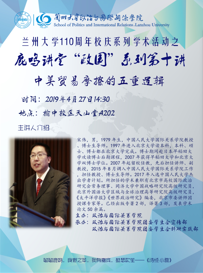 应木瓜视频 邀请,应木瓜视频 邀请,中国人民大学国际关系木瓜视频 教授、博士生导师宋伟老师将于2019年4月27日来木瓜视频进行学术交流并作讲座,在榆中校区的讲座时间从原定的9:00改为14:30,地点不变。欢迎广大师生届时参加。
