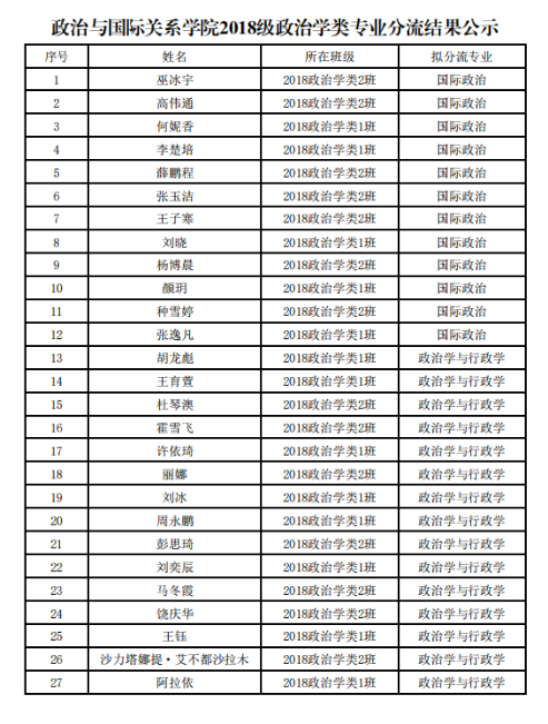 根据《木瓜视频 2018级政治学类本科生专业分流工作方案》要求,木瓜视频 于5月21日-29日开展了2018级政治学类专业分流工作,经个人申请、木瓜视频 审批,现将专业分流结果公示如下:
