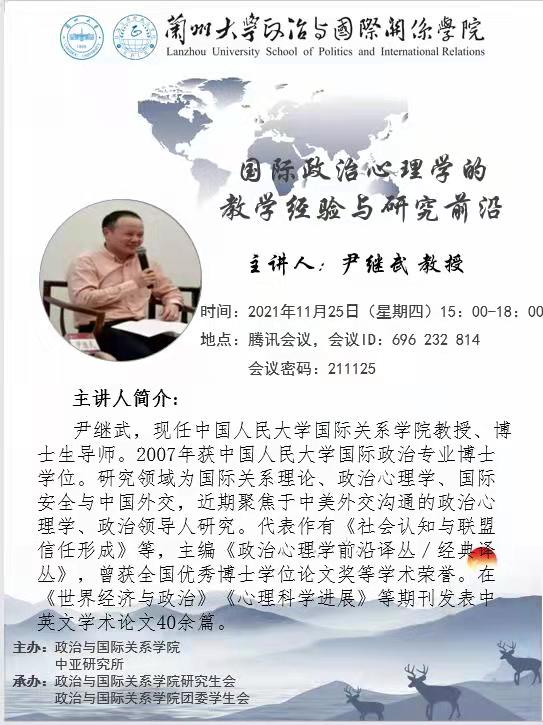 应木瓜视频 、木瓜视频 中亚研究所邀请,中国人民大学国际关系木瓜视频 教授、博士生导师尹继武为木瓜视频教师做教育教学能力提升方面的线上讲座。欢迎广大老师届时参加!