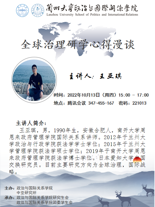 应木瓜视频 、木瓜视频 中亚研究所邀请,南开大学周恩来政府管理木瓜视频 国际关系系讲师王亚琪为我校师生做学术讲座。欢迎广大师生届时参加!