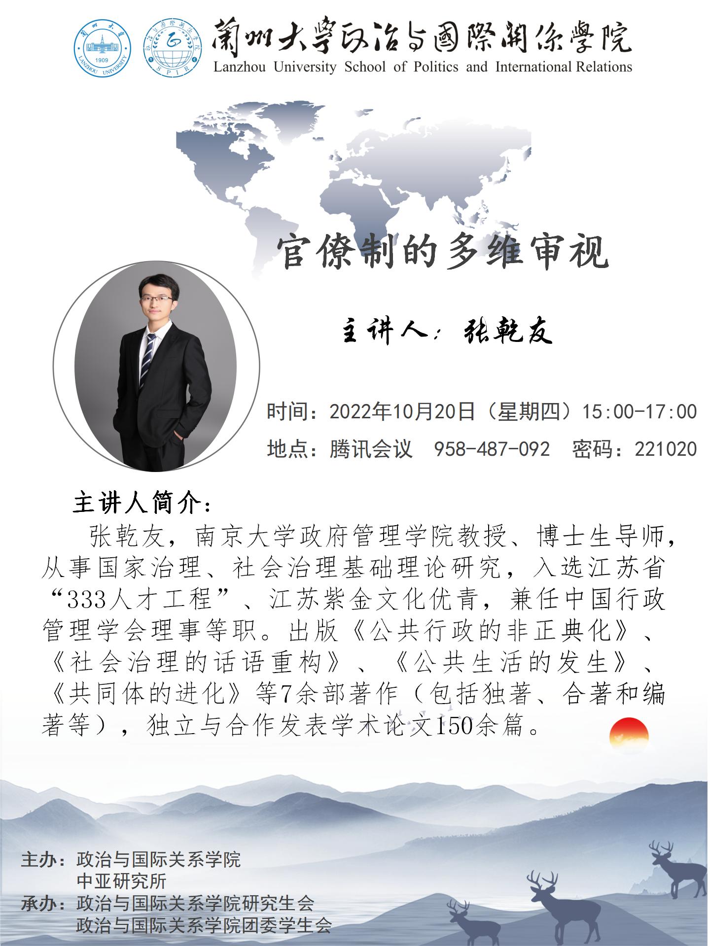 应木瓜视频 、木瓜视频 中亚研究所邀请,南京大学政府管理木瓜视频 教授、博士生导师张乾友为我校师生做学术讲座。欢迎广大师生届时参加!
