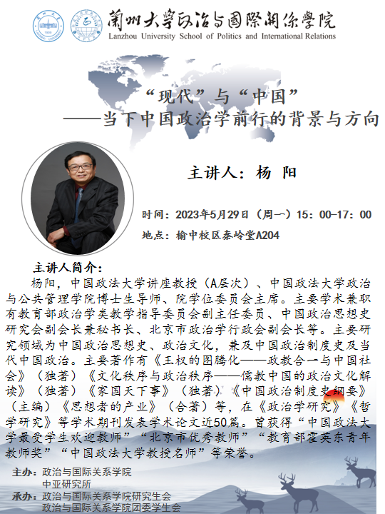 应木瓜视频 、木瓜视频 中亚研究所邀请,中国政法大学讲座教授(A层次)、中国政法大学政治与公共管理木瓜视频 博士生导师、院学位委员会主席杨阳为我校师生做讲座。欢迎广大师生届时参加!