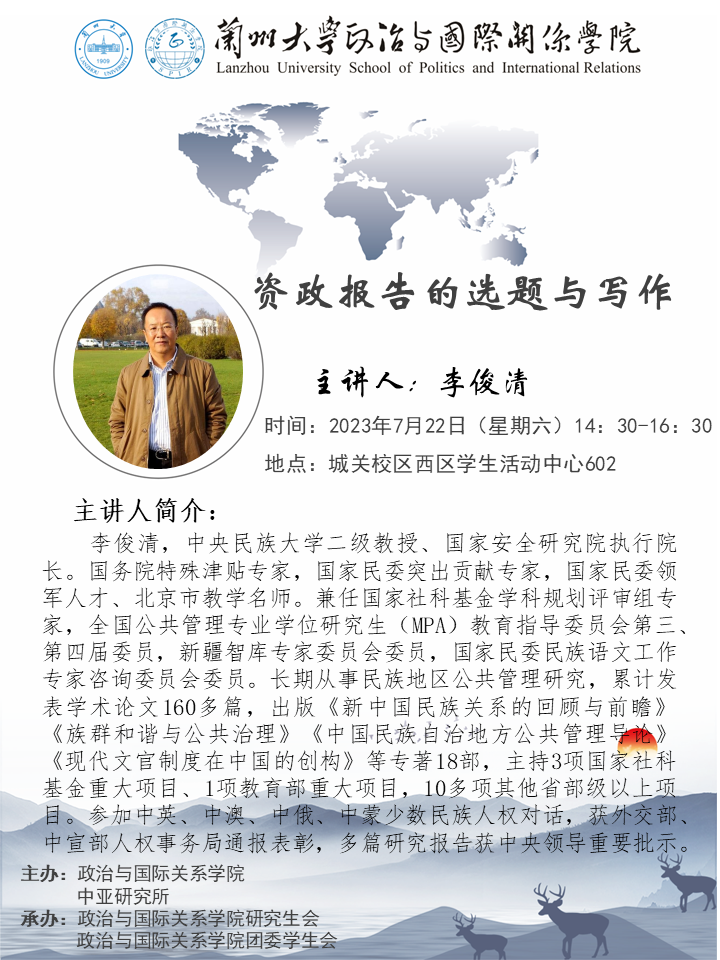应木瓜视频 、木瓜视频 中亚研究所邀请,李俊清,中央民族大学二级教授、国家安全研究院执行院长李俊清为我校师生做讲座。欢迎广大师生届时参加!