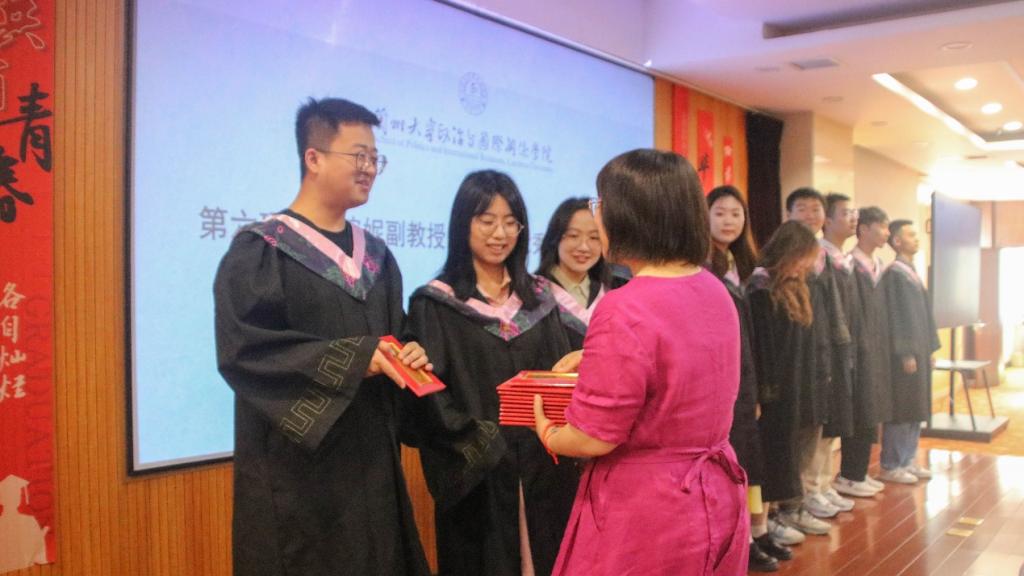 党委书记常虹、副院长高婉妮为研究生优秀毕业生及本科优秀毕业生颁发奖状,并由毕业生代表为几位班主任老师献花,班主任发放毕业生纪念品。