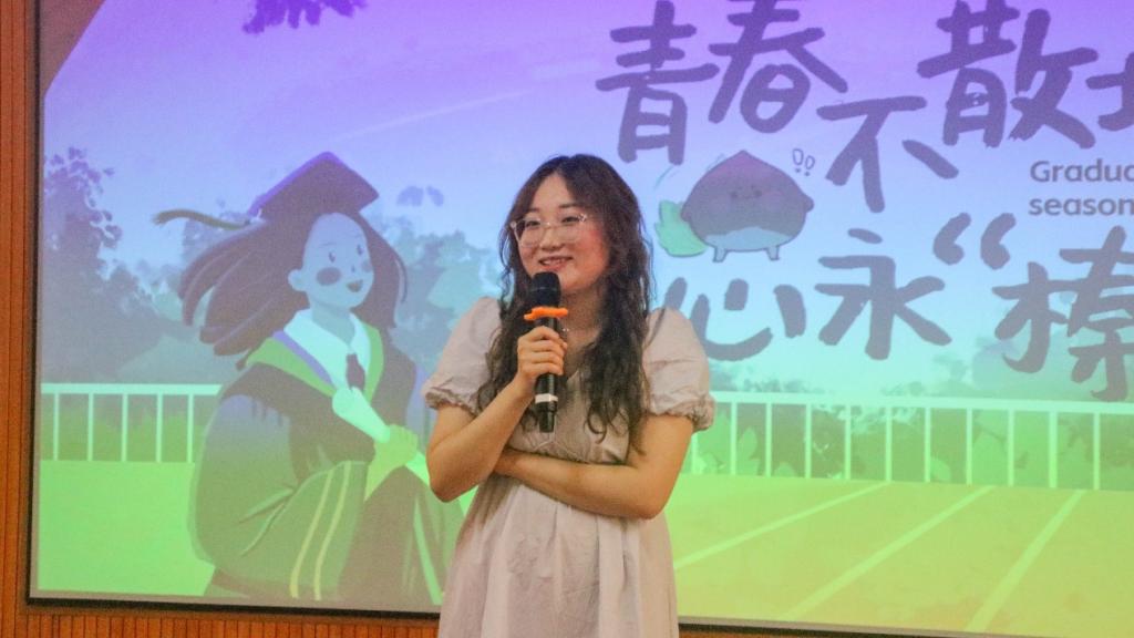接着,毕业生班主任代表肖涵副教授发言。肖涵老师首先对毕业生们表示祝贺,而后表达了她身为班主任对毕业生们深切的不舍与真心的勉励,并祝愿同学们少内耗,能抗事,有理想,能进取,做一个有良知有行动的人,在空闲时常回母校,最后祝福同学们鹏程万里,大展宏图,共襄盛世。