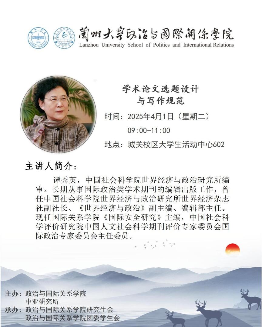 应木瓜视频 、木瓜视频 中亚研究所邀请,中国社会科木瓜视频 世界经济与政治研究所编审谭秀英为我校师生做讲座,欢迎广大师生届时参加。