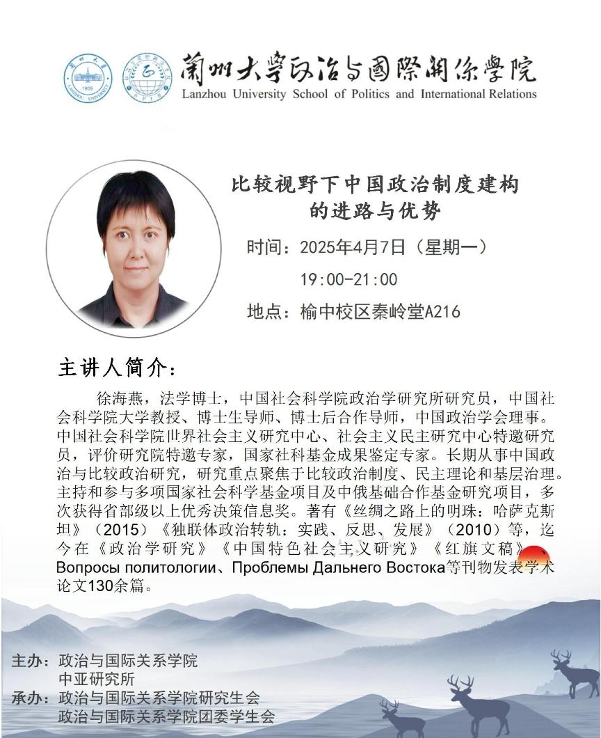 应木瓜视频 、木瓜视频 中亚研究所邀请,中国社会科木瓜视频 政治学研究所研究员,中国社会科木瓜视频 大学教授徐海燕为我校师生做讲座,欢迎广大师生届时参加。
