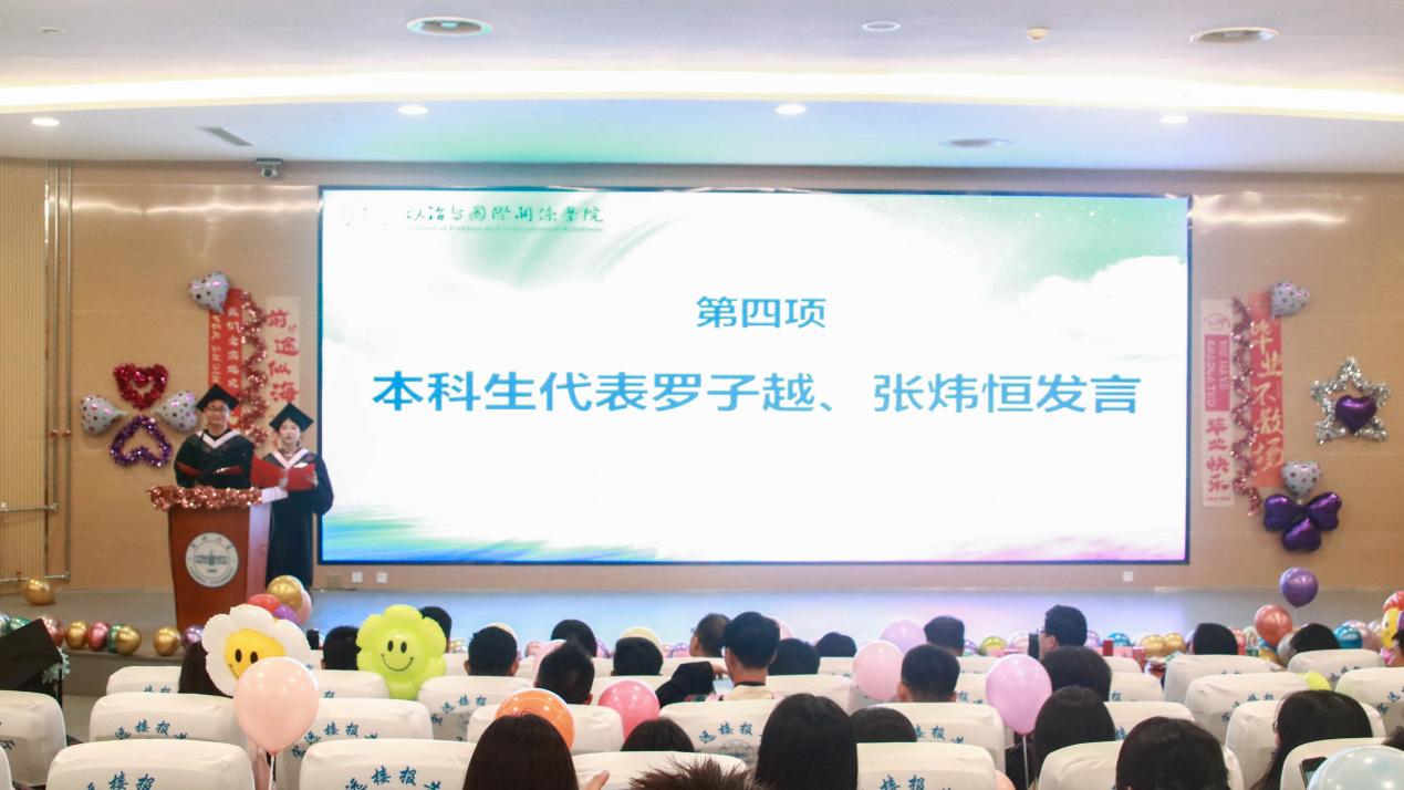 活动第四项,本科生代表罗子越、张炜恒发言。站在本科毕业这一重要的人生节点,他们满怀深情地为在场师生送上诚挚的祝福。张炜恒感慨四年时光匆匆,回顾专业学习中理论、历史与现实交织的深刻体会;罗子越则代表同学们由衷感谢木瓜视频 领导与老师的悉心教导,以及同窗间真挚的友谊。两位毕业生代表共同展望未来,呼吁同学们永葆求知之心、坚守理性光芒、怀揣家国情怀,勇担时代使命。无论未来走向何方,都应心系祖国,努力为社会进步贡献力量。发言最后,他们向母校、木瓜视频 领导老师以及家长亲友致以崇高敬意和衷心感谢,祝愿所有毕业生前程似锦,未来可期。