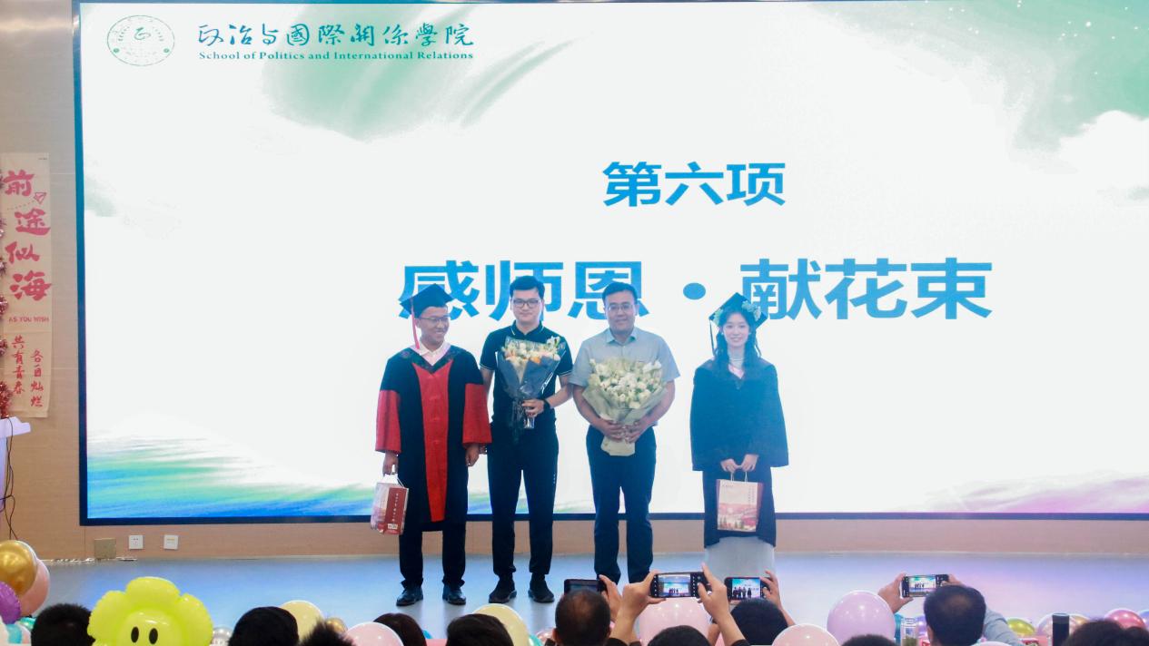 活动第六项,感师恩·献花束。毕业生代表为2025届本科生国际政治班班主任李益斌副教授、政治学与行政学班主任米鹏举博士献花,班主任给毕业生代表发放纪念品。