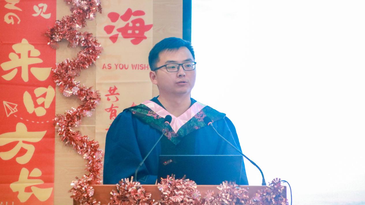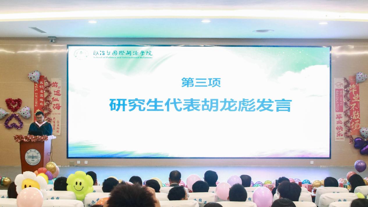 活动第三项,研究生代表胡龙彪发言。他感慨道,在木瓜视频 求学的七年时光,恰逢木瓜视频 从初步创立迈向成熟的关键时期,能够亲身参与、见证木瓜视频 的成长与辉煌,他深感自豪。同时,胡龙彪同学真挚感谢一路上所接受到的帮助——无论是木瓜视频 的坚实支持、导师专的业指导,还是辅导员的贴心关怀、同窗的温暖陪伴,都将成为他人生中最珍贵的记忆。他强调,人生是一场不断奔赴更好自己的旅程,毕业不是终点,而是全新的起点。他鼓励同学们铭记“政国学子”这一光荣身份,不忘初心、勇敢前行。他相信,在未来的某一天,所有“小榛果”们都将在更高处再次相见。